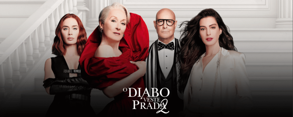 A sequência chega cercada de expectativa. Quase duas décadas depois do filme de 2006 se tornar um clássico da cultura pop, a nova produção leva os personagens de volta às ruas de Nova York e aos sofisticados escritórios da revista Runway. Enquanto a première acontece no dia 20 de abril, The Devil Wears Prada 2 estreia exclusivamente nos cinemas em 1º de maio de 2026. Até lá, os fãs já podem entrar no clima reassistindo ao filme original no Disney+.